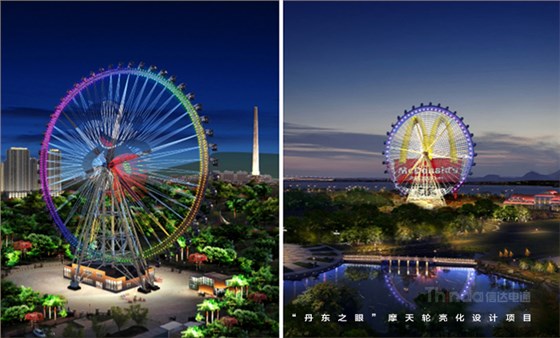 “丹東之眼”是中朝邊境一道亮麗的風景線,信達電通在設計中采用絢麗的燈光和濃重的色彩。設計師通過燈光的動態變化、光色的轉換,創造出一個歡樂、覽勝的燈光樂園。當夜晚降臨,彩燈閃爍,摩天輪一圈圈地劃過點亮丹東最美天際線,顯現出其非凡的魅力!