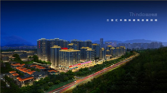 三亞匯豐國際夜景照明設計方案突出了匯豐國際建筑本身的特點,而且燈光的表現手法也非常獨特,為了營造出不同時段的夜景照明效果,經過信達電通照明設計師的前期現場勘查和與業主的溝通,設計了平日模式-節能模式-深夜模式等不同時段夜景照明模式設,以供其使用。