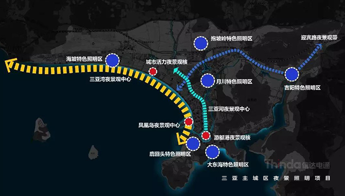 2016年,三亞開展“雙修”工作,城市夜景照明升級改造被列入了“雙修”工作的內容。為打造符合三亞城市建設定位和地域文化特征的夜景,信達電通對三亞整體夜景重新規劃設計。通過特色夜景打造,提高城市吸引力,展現三亞“國際、熱帶、濱海、旅游”核心氣質。