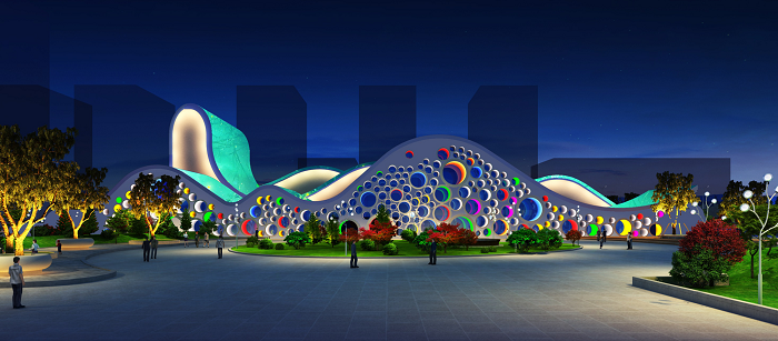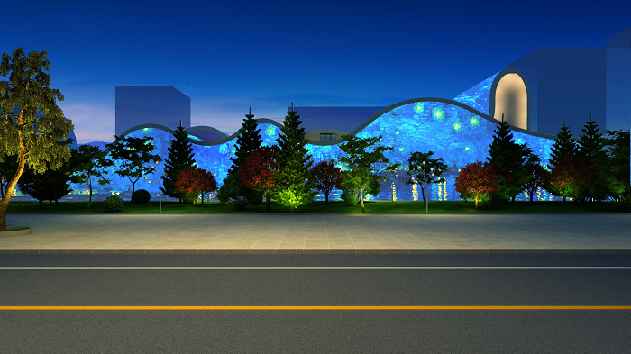 美術館建筑整體是曲線勾勒頂部與圓形創意形態展現立面結構相結合。照明手法是將建筑在白天的曲線美,通過燈光向夜晚延伸。