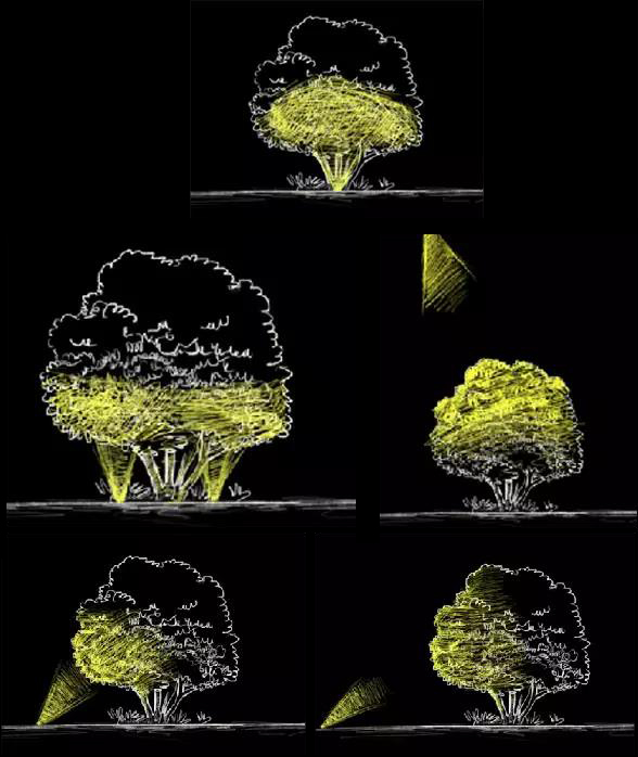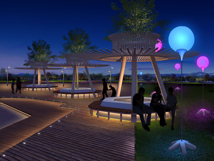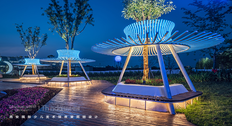 廣場燈光從色彩上尋求變化,增加燈光與人的完美互動。區域以高亮度照明呈現,節假日以彩光呈現,突出入口標識性設計。廣場綠植依據植物的大小形態進行燈光設計,燈具隱藏,綠色生態,營造舒適的夜間光環境。