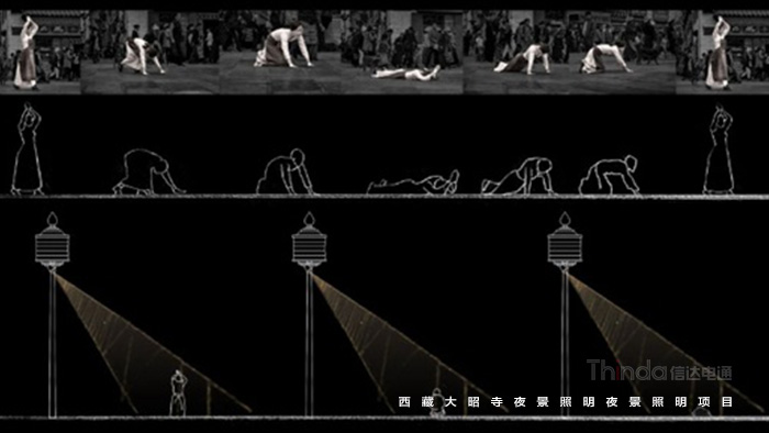 3)重大節(jié)日模式下所有照明燈具全開,重要節(jié)點(diǎn)投影經(jīng)文開啟,使大昭寺成為一個(gè)巨大的轉(zhuǎn)經(jīng)筒與朝拜的人一起緩緩轉(zhuǎn)動(dòng)。