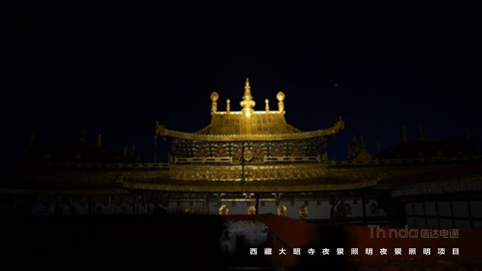 大昭寺是四層樓的碉堡式建筑結(jié)構(gòu),各殿宇樓頂形狀高低不一,為全面營造金頂?shù)囊归g氛圍,信達(dá)科技采用投光燈投射金頂?shù)脑O(shè)計(jì)方案。投光燈分布在圍繞大昭寺的十個(gè)點(diǎn)位上,根據(jù)被照物高度、角度設(shè)置燈具數(shù)量、高度、角度、方向,以實(shí)現(xiàn)金頂?shù)恼w亮度統(tǒng)一。