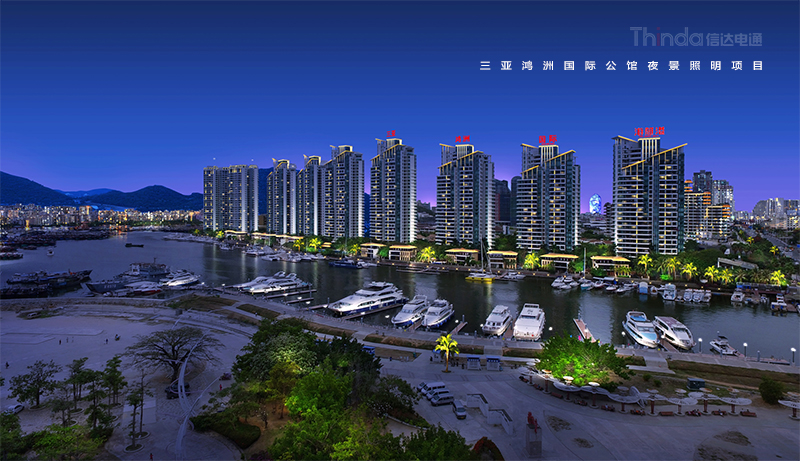 在設計之初,信達夜景照明設計師,將三亞鴻洲國際公館夜景照明效果放在了三亞時代海岸東岸整體的夜景照明規劃中考慮,三亞鴻洲國際公館夜景照明的目標應與三亞時代海岸東岸夜景照明的整體目標相一致,讓業主理解到其夜景照明不是奢華性投入,也不是簡單的“亮化”,應該符合三亞時代海岸的夜景照明“提升旅游、服務旅游”的目標宗旨和鴻洲國際的商業服務性質。根據三亞鴻洲國際的建筑造型,信達電通確定了以展示獨特“V”形建筑立面為主要表現點,信達電通在展示建筑外立面的獨特美感同時,也烘托出了三亞鴻洲國際的文化,使三亞鴻洲國際在整個三亞時代海岸顯得溫馨,靜雅。