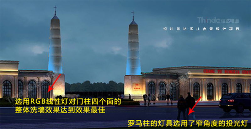選用RGB線性燈對門柱的四個面的整體洗墻效果達到更佳,羅馬柱的燈具選用了窄角度的投光燈。