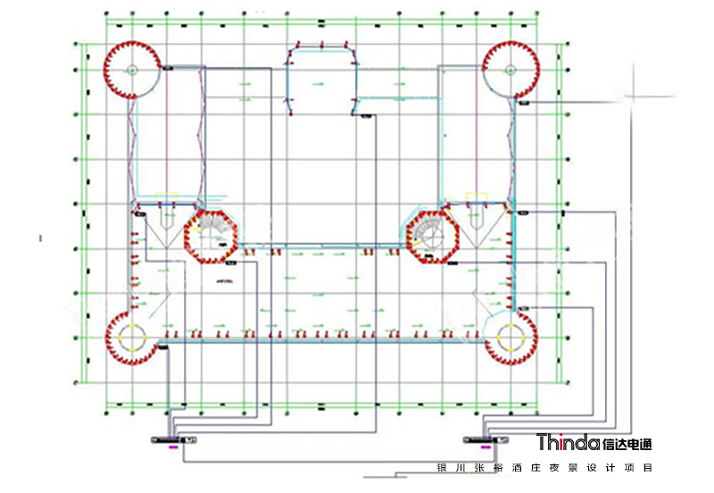 在銀川張裕夜景照明項目中設計師在燈具選擇時選用了品字形LED燈具,使得燈具在色彩變換上能夠達到設計師的設計思想。
